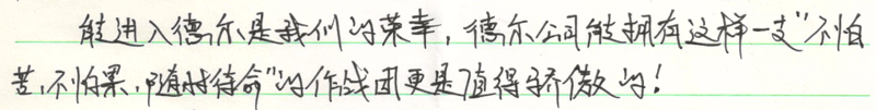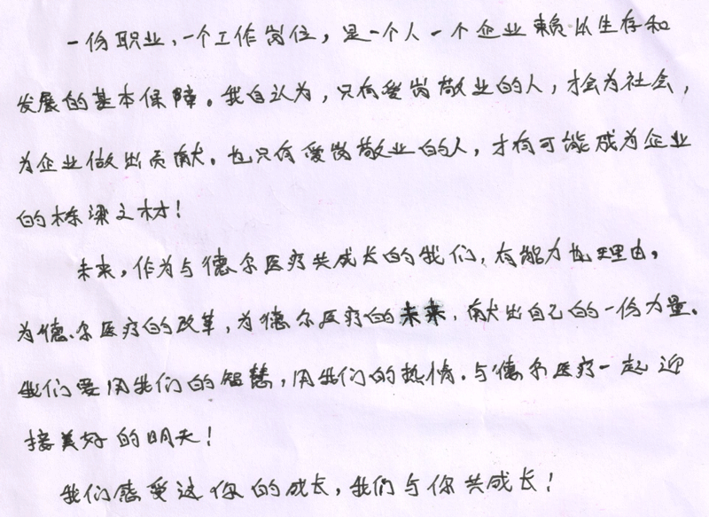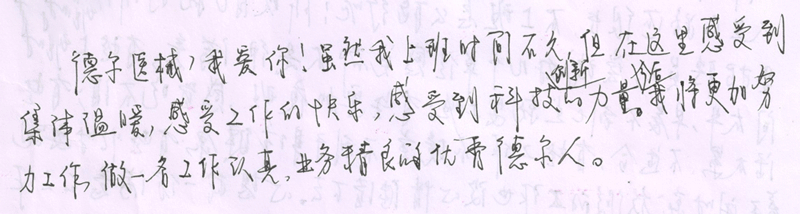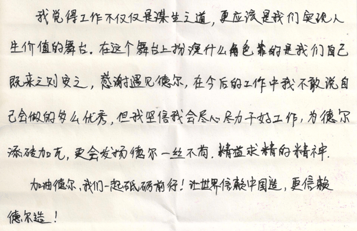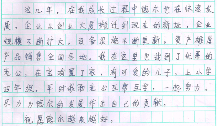 我很感謝德爾給了我工作的機會,不僅可以增加家庭的經(jīng)濟(jì)收入,而且也讓我深刻的認(rèn)識到自己工作的重要性,同時也讓我明白了自己的價值所在,在以后的工作中,我仍然會認(rèn)真的對待自己的工作,認(rèn)真生產(chǎn)每一件產(chǎn)品,繼續(xù)把工匠精神發(fā)揚光大。