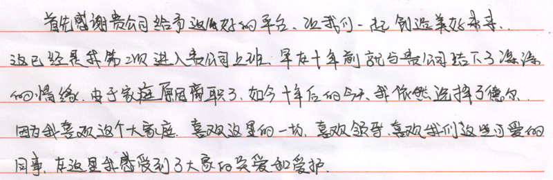 我們從一個滿臉稚氣的青春少女來到德爾,到現(xiàn)在獨當(dāng)一面處理種種業(yè)務(wù)到處世,是我們用我們最平凡的雙手和不放棄的精神創(chuàng)造了德爾見證了德爾今天的不平凡,德爾也用它的成長史教會我們知恩、感恩、堅持、貢獻(xiàn)的精神。